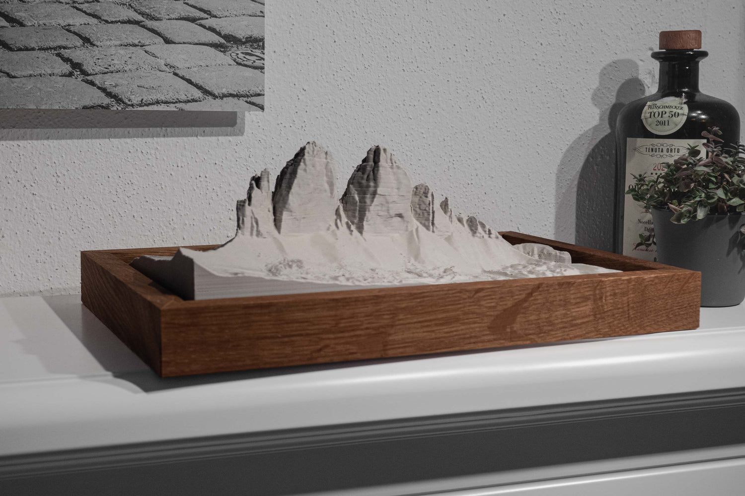 Durch unsere Erfahrung mit CAD, Geländedaten und additiven Fertigungstechniken haben wir den Prozess so weit optimiert, dass wir aus PLA eine außergewöhnlich hohe Detailtreue herausholen können. Konturen, Grate und Täler werden sauber herausgearbeitet, ohne dass das Modell unruhig oder technisch überladen wirkt. So entsteht ein Bergrelief, das klar lesbar ist, topografisch stimmig und trotzdem angenehm ruhig wirkt – egal, für welchen Ausschnitt du dich entscheidest.