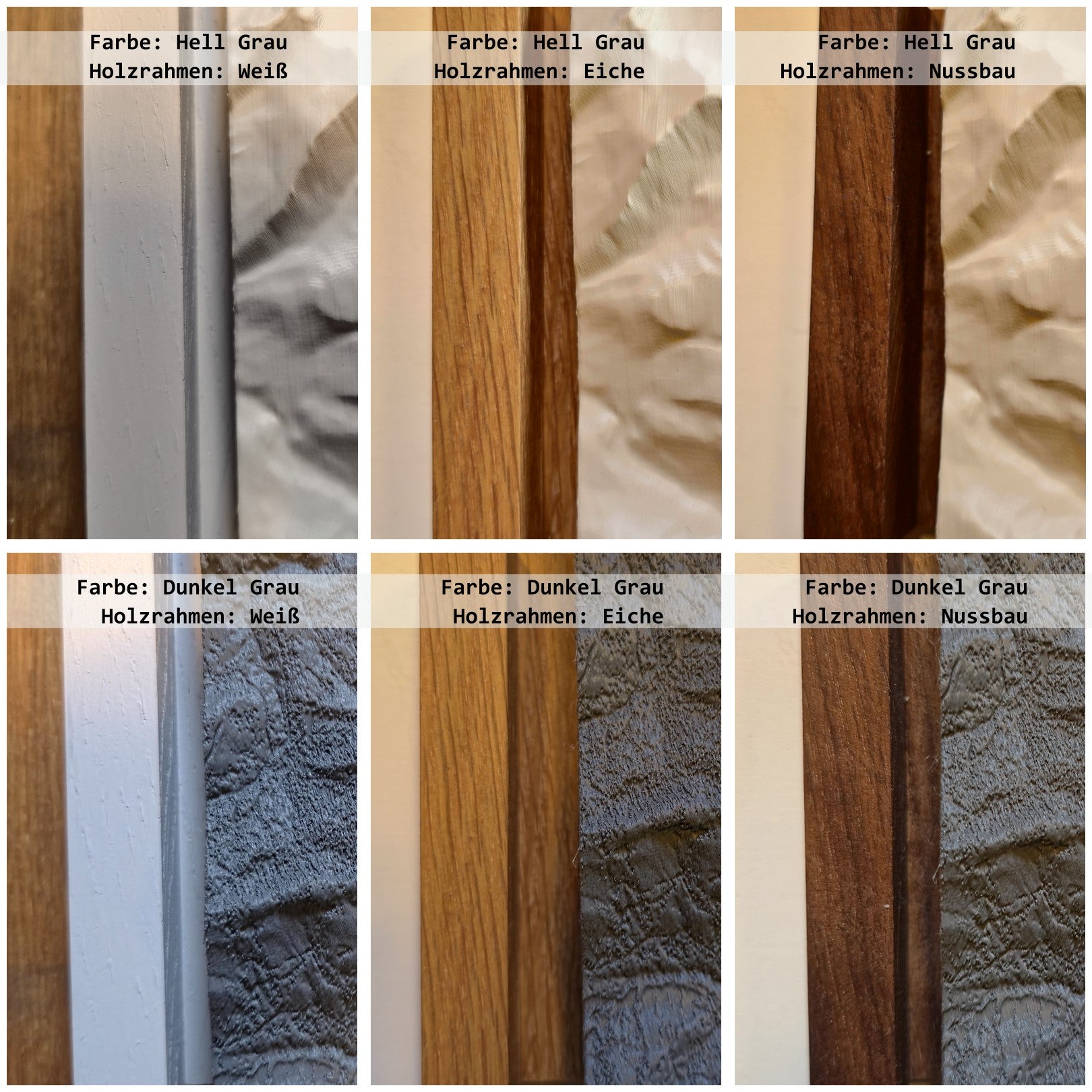 🔹 2. Farbe & Rahmen bestimmen: Wähle die Farbe deines Reliefs (hell oder dunkel) und kombiniere sie mit einem Rahmen in Eiche, Nussbaum oder Weiß – so entsteht dein persönlicher Stil.